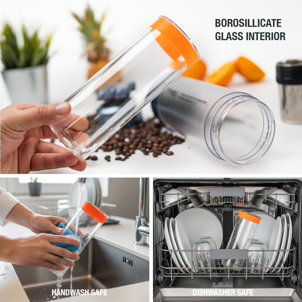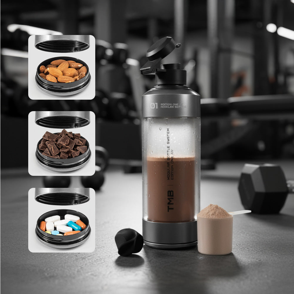 No random details — every module exists for function. Swap tops depending on your drink. Storage modules for supplements or snacks. Removable strap, tea & fruit infuser. Borosilicate glass core.