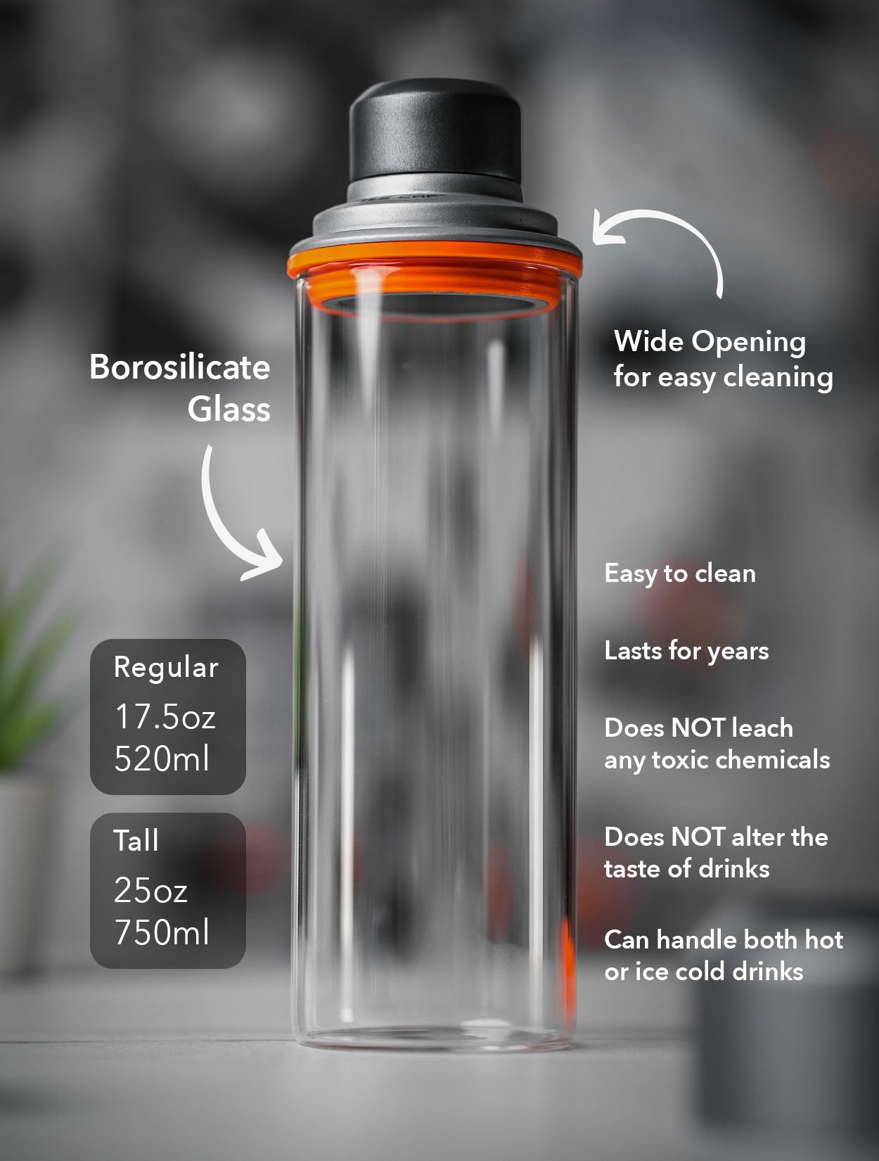 Plastic bottles are bad for our health, get smelly and are hard to clean properly.. Thatβs why our bottle is made from reinforced, temperature resistant borosilicate glass.